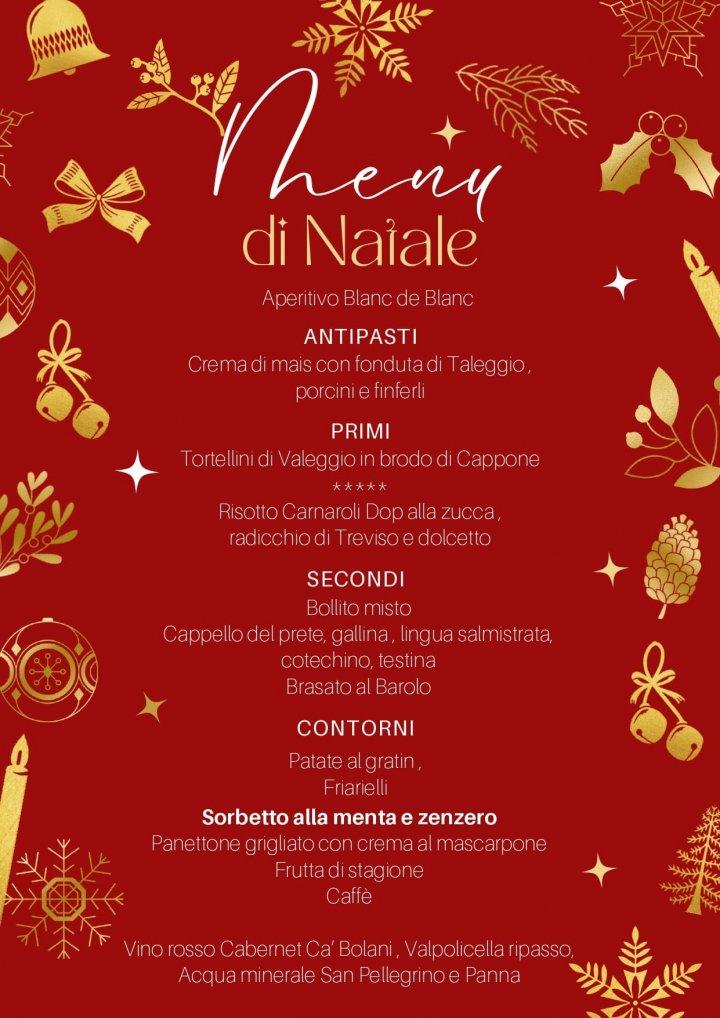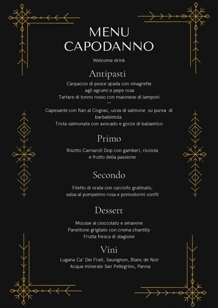MENU CAPODANNO Welcome drink ANTIPASTI Carpaccio di pesce spada con vinagrette agli agrumi e pepe rosa Tartare di tonno rosso con maionese di lamponi ** Capesante con flan al Cognac, uova di salmone su purea di barbabietola Trota salmonata con avocado e gocce di balsamico ** PRIMO Risotto Carnaroli Dop con gamberi, ricciola e frutto […]